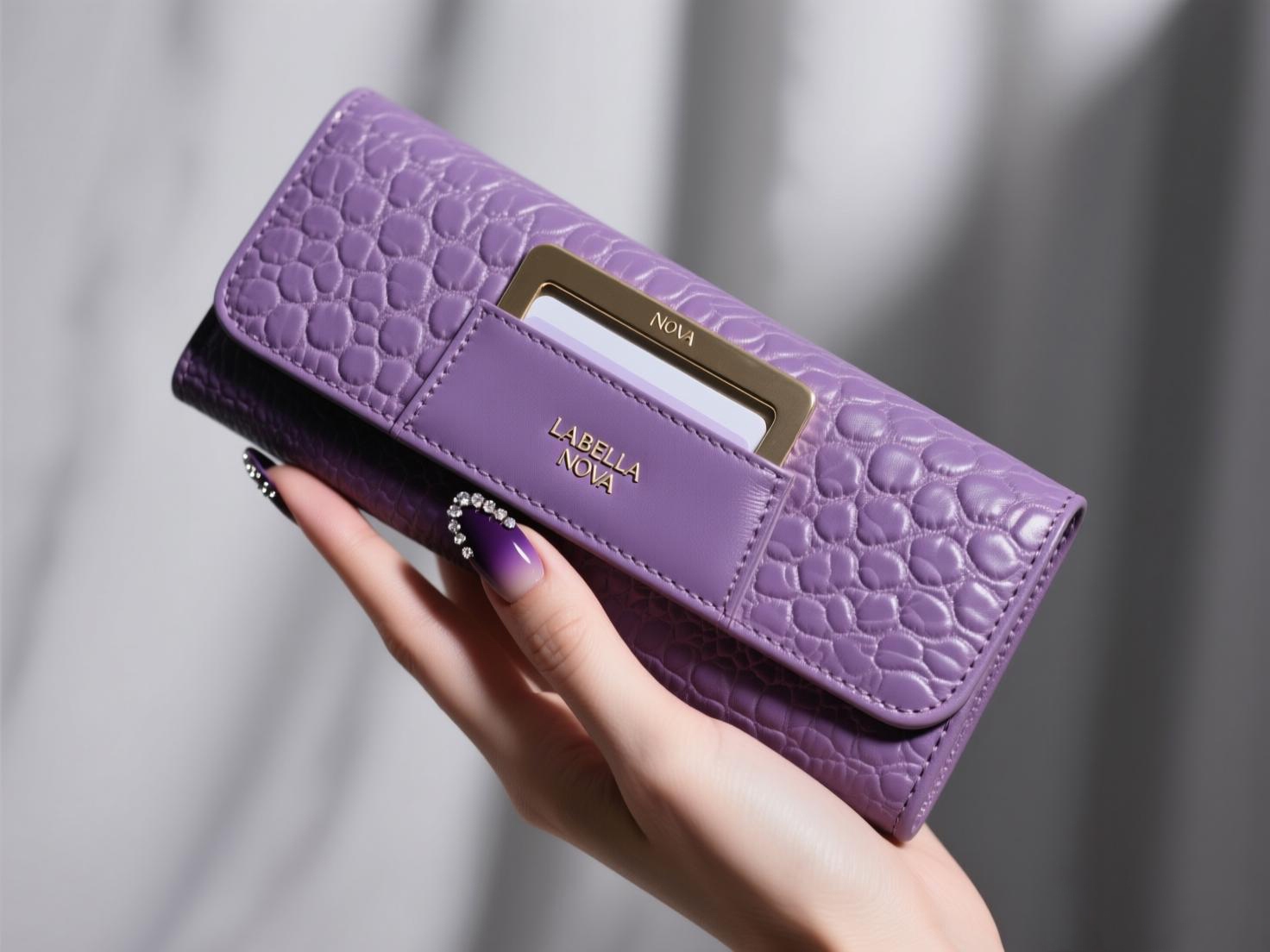 As a specialized leather goods manufacturer, we produce premium crocodile-embossed long wallets designed for brands and wholesalers. This purple model features precise stitching, luxurious crocodile-textured leather, and elegant gold-toned hardware customized with your branding (as shown in the “LABELLA NOVA” sample).