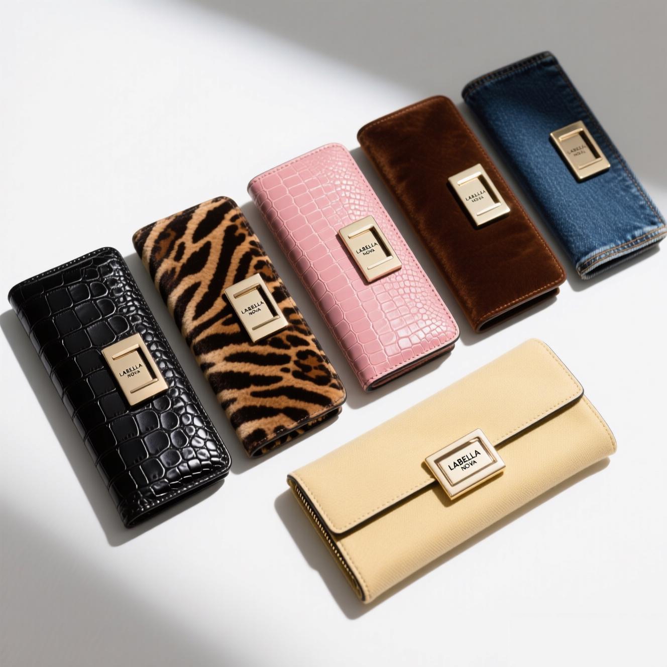 As a specialized leather goods manufacturer, we offer custom long wallets with premium metal clasps and personalized branding. This collection showcases 5 material variations: classic croc-embossed leather (black), bold leopard faux fur (brown/black), luxurious velvet (deep brown), durable denim (blue), and soft smooth leather (cream). Each wallet features a gold-toned clasp engraved with your logo (e.g., “LAVAZZA NOVA” as shown). Our factory supports full customization—including material swaps, size modifications, and packaging—with rigorous quality checks on stitching and hardware. Ideal for fashion brands, retailers, and corporate gift suppliers seeking high-volume production. Contact us for competitive pricing and sample requests.